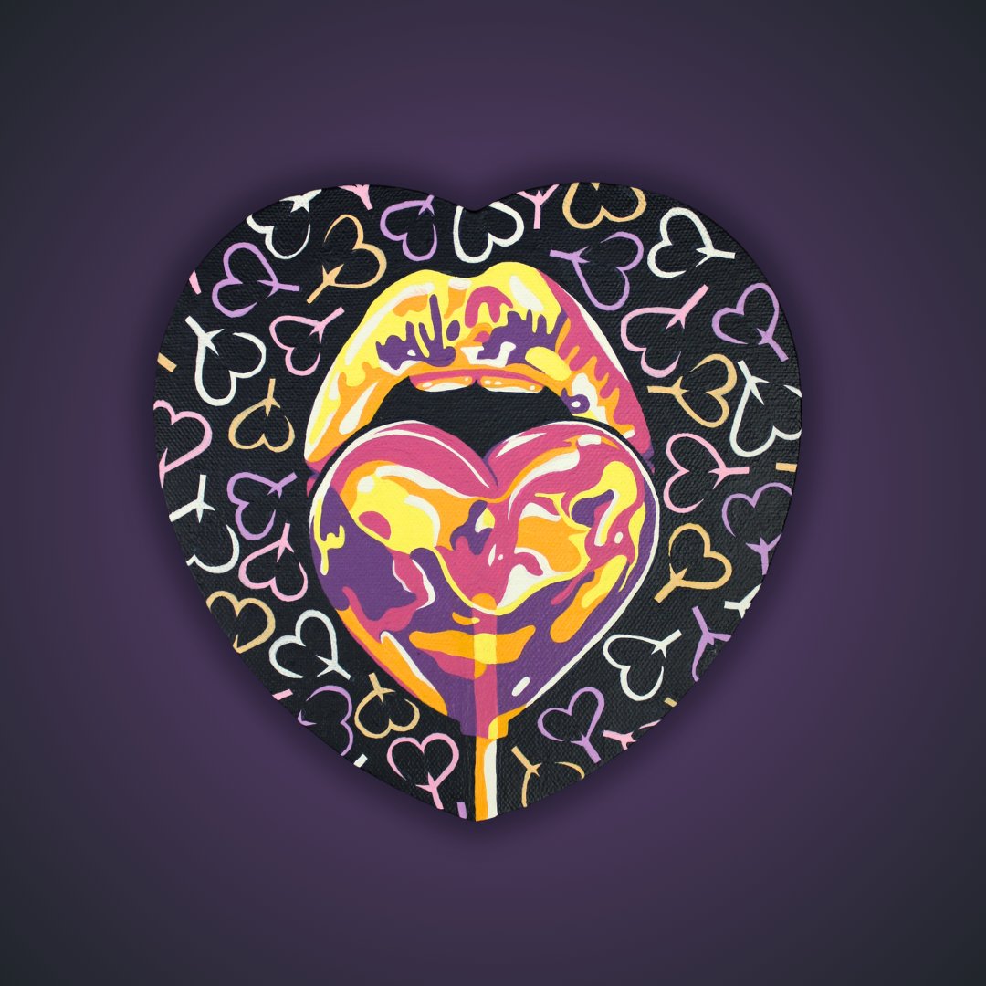 Candy Kiss radiates playful charm, featuring vibrant lips with a heart-shaped lollipop at the center. A lively lollipop pattern fills the background, creating a whimsical and energetic atmosphere. The use of bright and bold colors intensifies the visual impact, capturing a sense of sweetness, fun, and flirtatious energy that delights the viewer.
